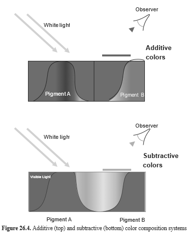 Pigments impart color to the final formulation. They can be of two types: absorption pigments of interference pigments. Absorption pigments give color by absorbing part of the visible light spectrum. Their observed color results from reflection of the nonabsorbed light spectrum. Combining absorption pigments needs to consider the reflected light colors in order to avoid overlap of reflected light wavelengths and absorbed wavelengths. This is termed “subtraction color composition.” It is illus- trated by a trichromatic schematic showing that blue is the result of light absorption in the yellow or that red is the resulting color of light absorption at red wavelengths. Combining red and blue absorption pigments will yield a green shade instead of magenta. A good example of this color composition system is the CMY (cyan/ma- genta/yellow) system widespread in the printing industry. In a subtractive system, one starts from a neutral white light spectrum and each pigment removes a specific wavelength region from the white spectrum, leaving its remaining colors [4].