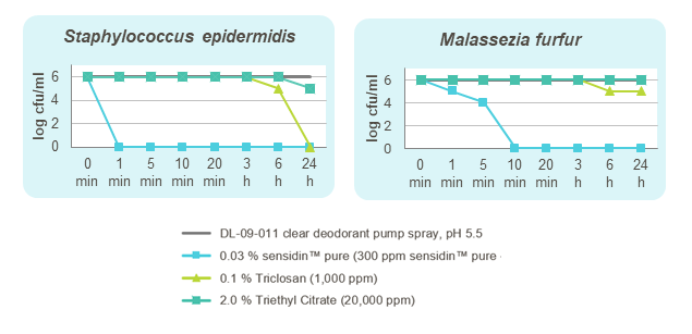 “The combination of active ingredients represents a contemporary deo solution in a category of goods that continues to grow,” said Karin Stoffels, head of product development microbial protection, Ashland. sensidin™ pure skin multifunctional takes deodorant protection to a new level. Its very strong and fast-acting efficacy has been proven within a germ count reduction test. sensidin™ pure skin multifunctional has been tested in comparison to other deo actives such as Triclosan and Triethyl Citrate in a clear deodorant pump spray. The results show the remarkable fast efficacy of only 0.03% sensidin™ pure skin multifunctional within the first minute against odor-causing bacteria as well as the yeast Malassezia furfur within 10 minutes.