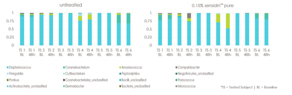 The study result showed that no differences were found at baseline between both areas, which means that the microbiome was comparable before application – even after 48 hours. Thus, as proven sensidin™ pure skin multifunctional has no impact on the healthy skin microbiome. In addition, the test subjects have stated that they perceive the tested product as being gentle to the skin while leaving a pleasant skin feeling and not burning on the skin as well.