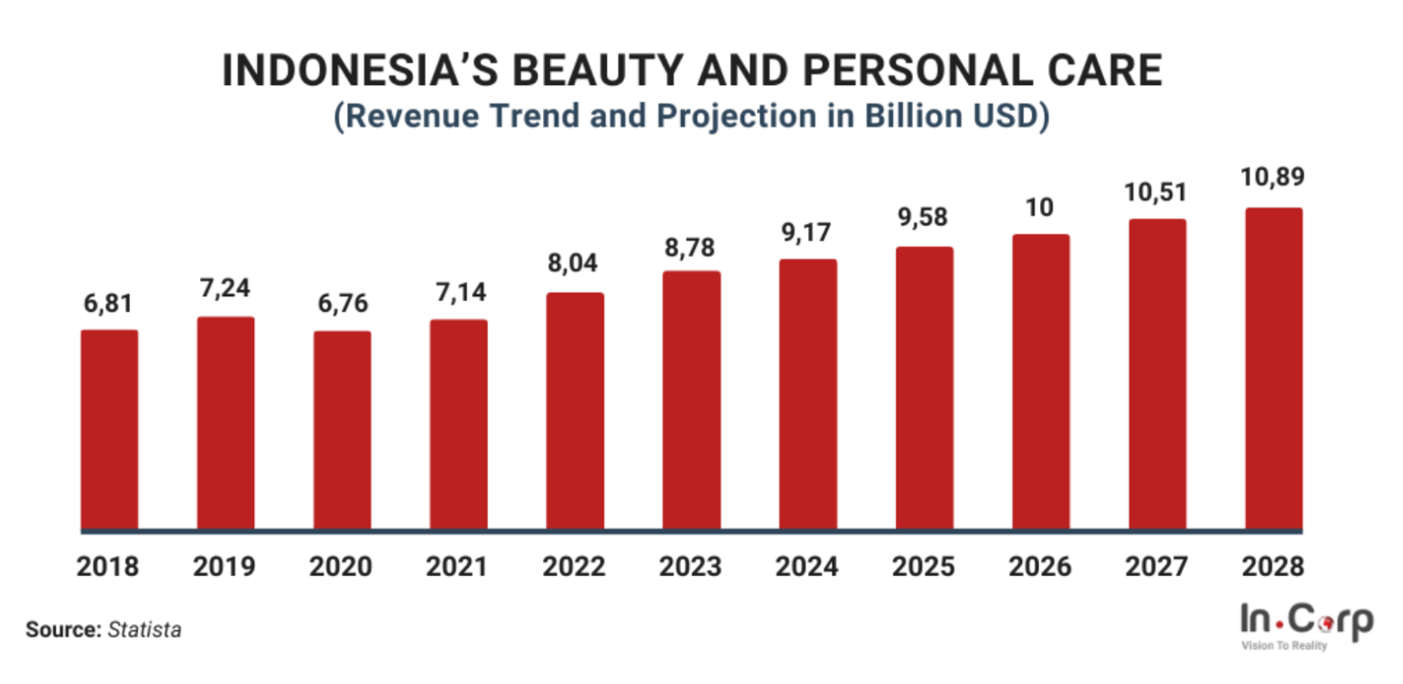 Young and fast growing, the total cosmetics market revenue of Indonesia has reached US$ 9.17 billion and is projected to reach nearly US$10bn as of 2028, growing annually by 4.6% (CAGR 2025-2028) (Insight of Consulting, 2024).