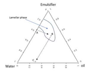 In Figure 3, to reach the target composition (C) with eventual emulsifier loading of < 5%, we start with an emulsifier water solution with > 60% emulsifier molecule (A). Oil is then added to this mixture to reach the intermediate (B). It is critical that the intermediate is within the lamellar phase so that the maximum amount of lamellar liquid crystals is formed. Finally, appropriate amounts of water and oil are added to the intermediate to reach the target composition (C).