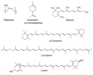 Terpenes are natural, unsaturated hydrocarbons with formulas (C5H8)n, where n > 1, and are classified by number of carbons: monoterpenes (C10), sesquiterpenes (C15), diterpenes (C20), triterpenes (C30), and tetraterpenes (C40), for example (Figure 3).